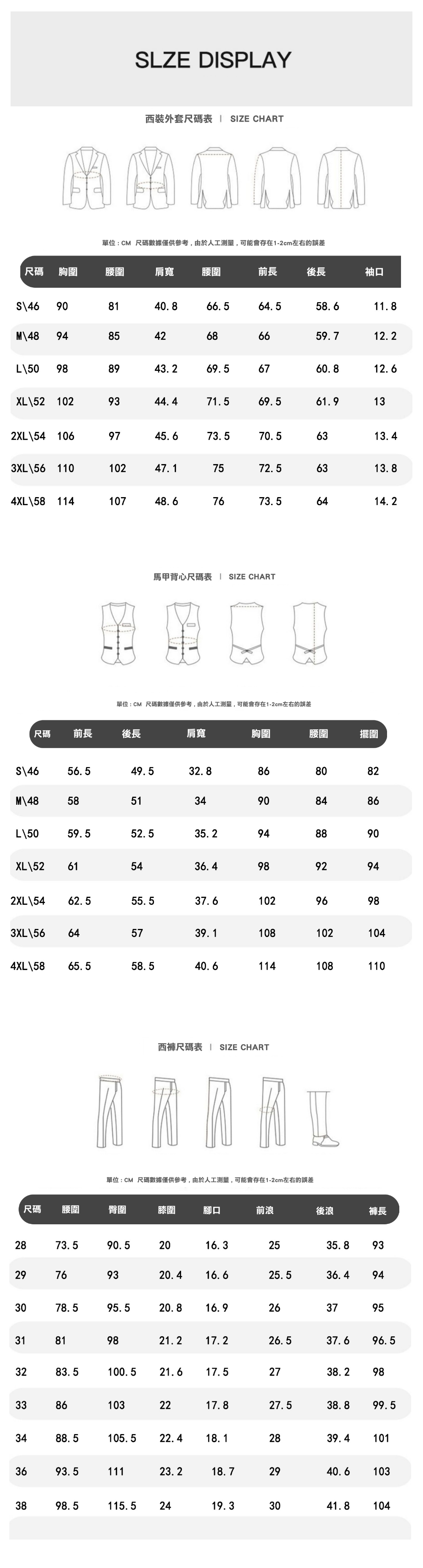 4XL : 身高 165-185 cm , 體重 78-83 kg , 褲子34-36-38