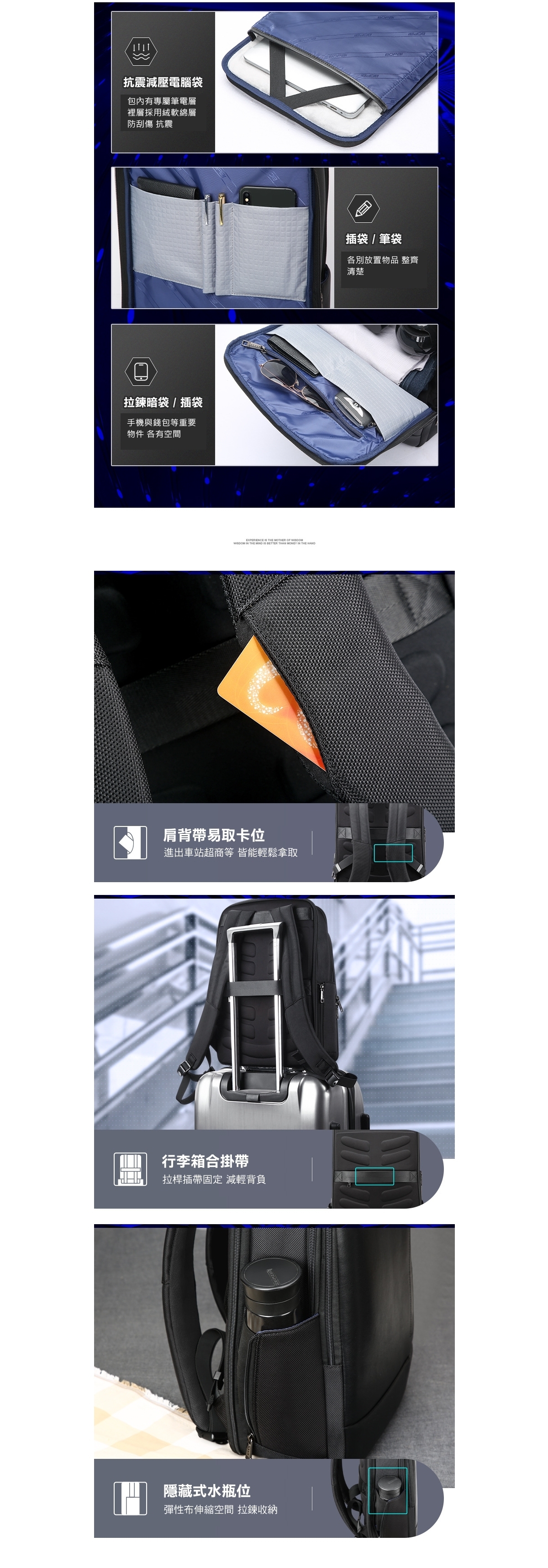結構: 側袋*1 前袋*1 前層*1 中層*1 插袋*2 拉鍊袋*1 後層*1 筆電袋*1 插袋*2 筆袋*2 背帶卡位*1 背面拉鍊袋*1 USB外充*1 行李箱插槽帶*1