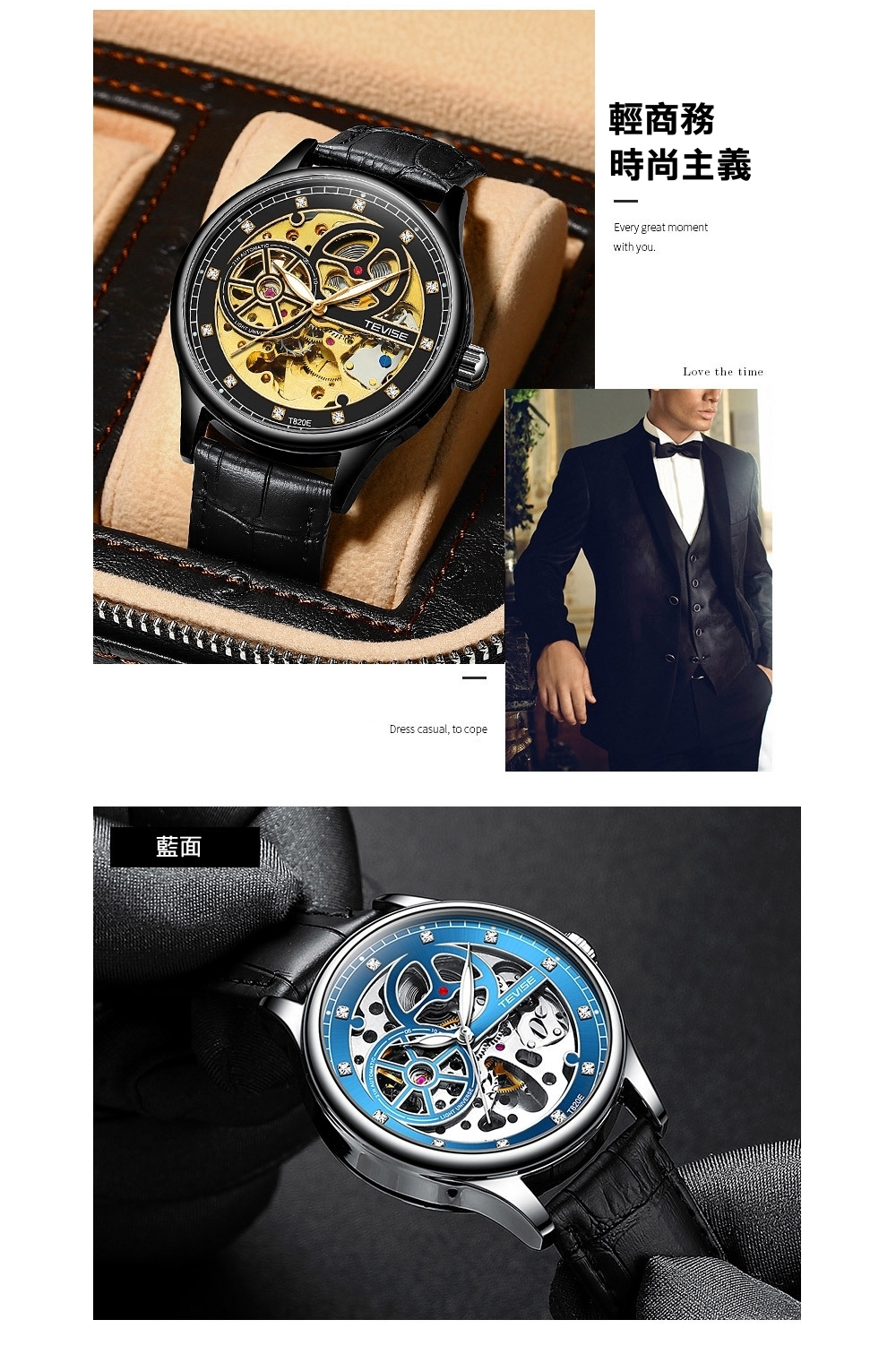 瑞士Tevise華麗水鑽全鏤空真皮機械錶【TV820E】