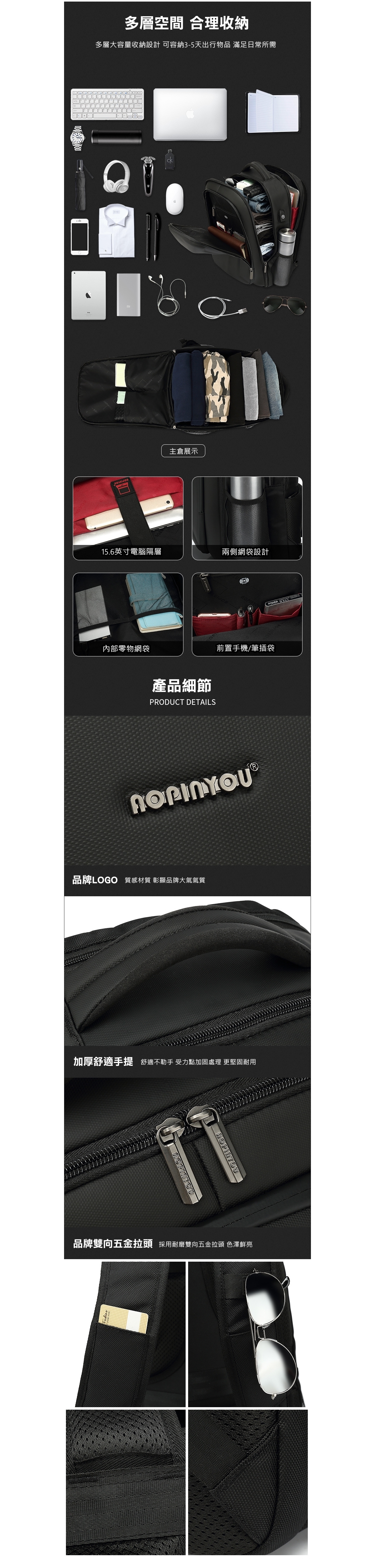 結構: 前層*1 內拉鍊袋*1 插袋*2 筆袋*2 主層*1 插袋*2 網袋*2 後層*1 筆電層*1 IPAD層*1 側袋*2 行李箱掛帶*1 背面拉鍊袋*1 背帶卡袋*1 眼鏡掛帶*1
