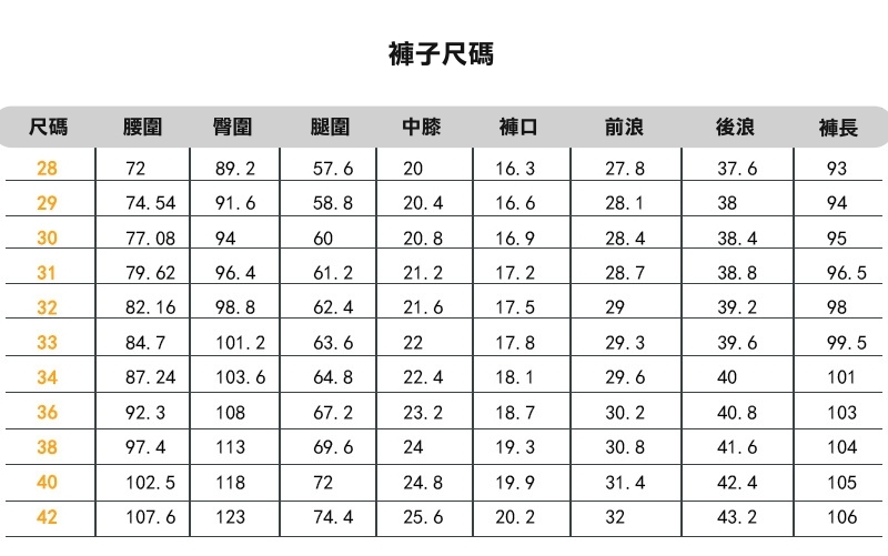 38-40-42 : 身高 170-185 cm , 體重 93-105 kg
