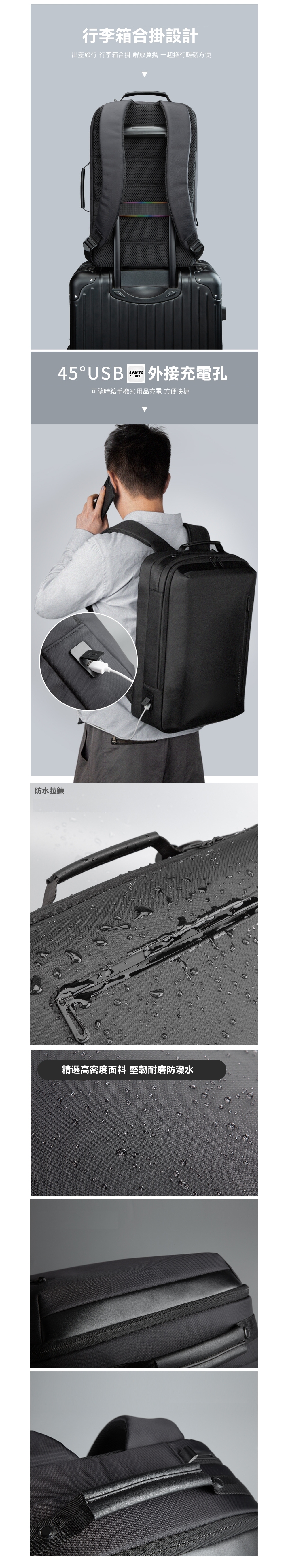 結構: 正面拉鍊袋*1 前主袋層*1 主層*1 網眼拉鍊袋*1 插袋*2 筆袋*2 隔層袋*1 後層*1 筆電層*1 背部拉鍊袋*1 USB外充*1